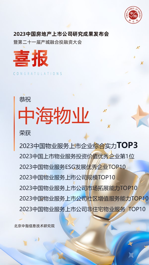 5月18日,由中国企业评价协会、清华大学房地产研究所、北京中指信息技术研究院主办,北京中指信息技术研究院中国房地产TOP10研究组承办的“2023中国房地产上市公司研究成果发布会暨第二十一届产城融合投融资大会”召开。会上,中海物业获颁多个奖项。