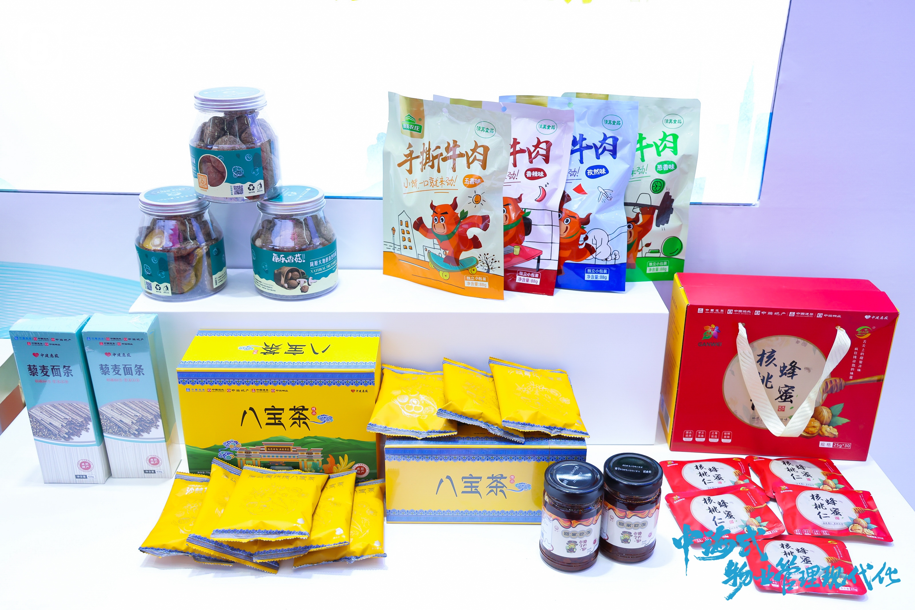 同时,备受关注的还有乡村振兴展台。核桃乳、蜂蜜核桃仁、香辣牛肉酱、干香菇脆、藜麦面条、手工腐竹……看到这些琳琅满目的农产品,观众们还以为自己走进了特产超市。其实这里是中海物业助农产品展台,大家亲口品尝来自甘肃省康县、康乐县、卓尼县的纯天然食品。“这些都是中海物业自主研发的助农产品,我们汇聚政府、企业、乡村、业主的多方力量,通过技术帮扶、就业帮扶、消费帮扶等方式丰富乡村振兴新实践。”现场展示人员介绍说。