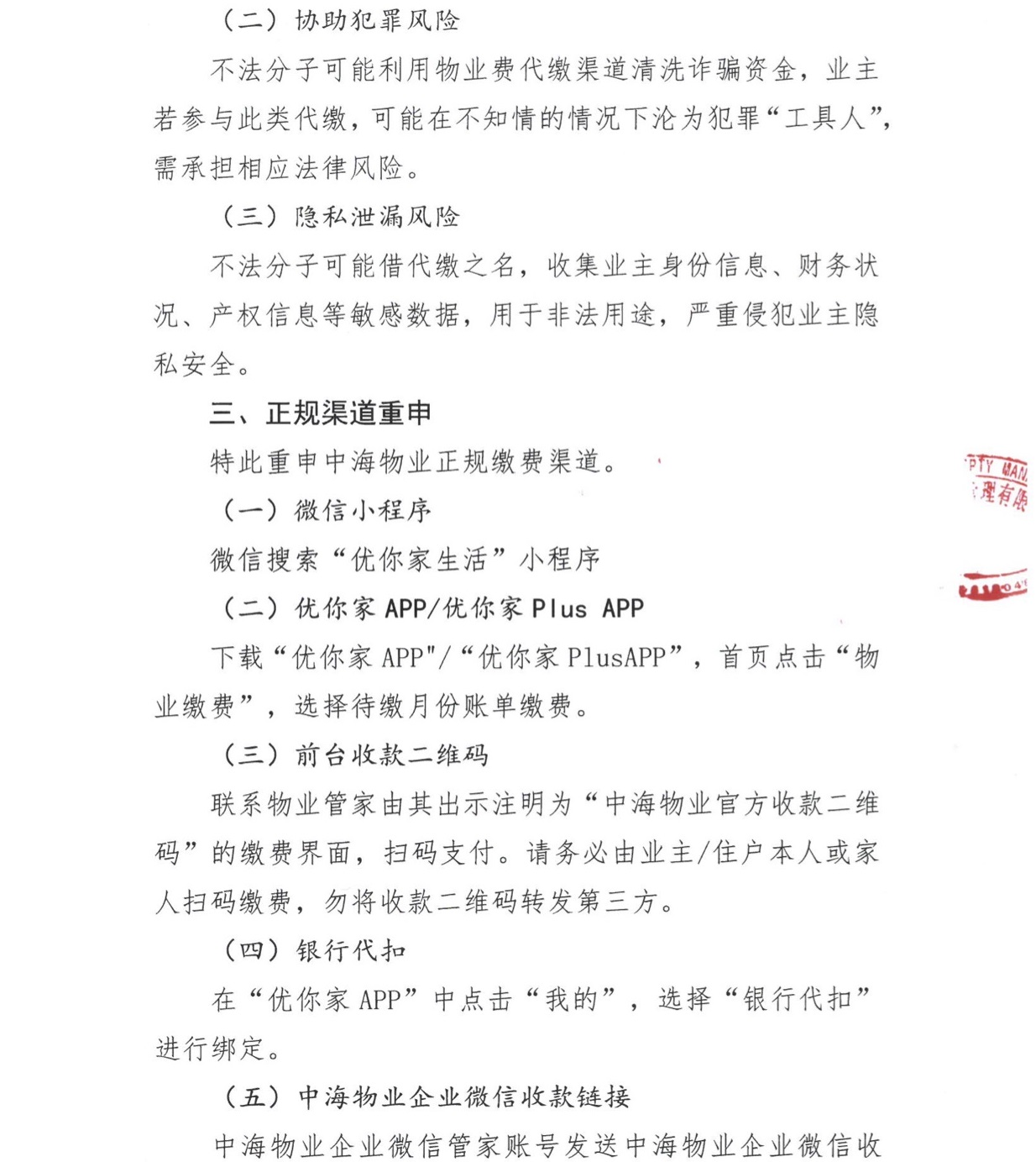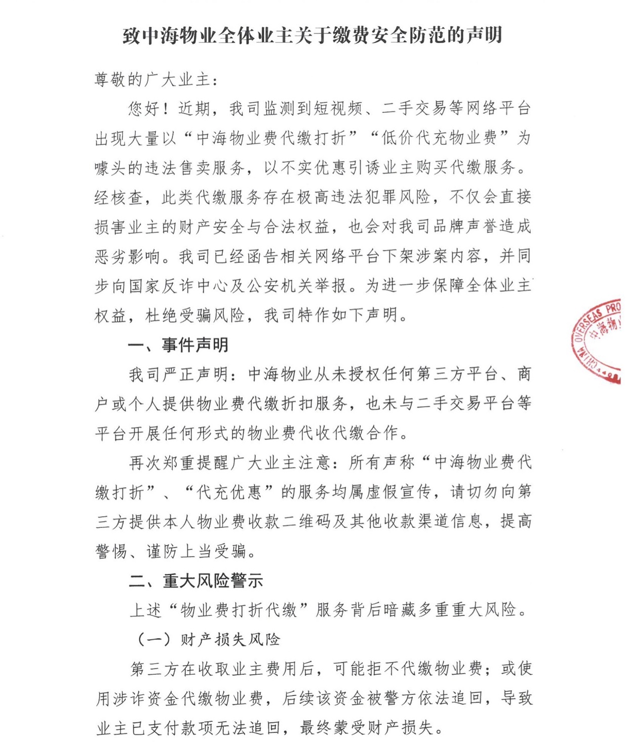 致中海物业全体业主关于缴费安全防范的声明